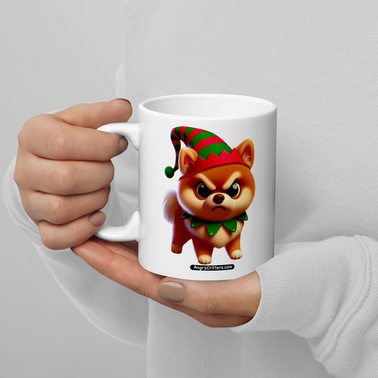 Holiday Pomeranian in Elf Hat, White glossy mug
