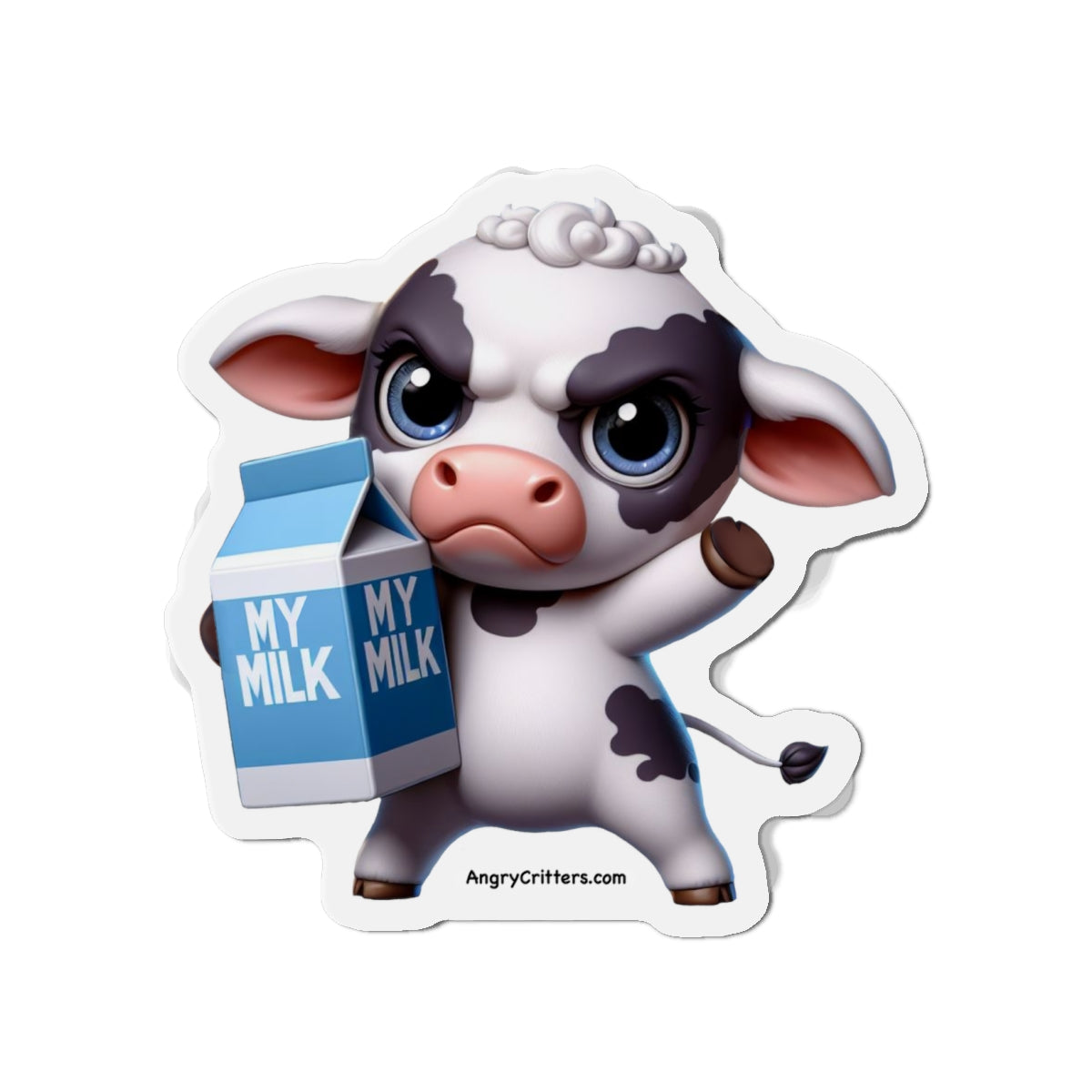 Cute angry cow claiming milk as his own. This die-cut magnet is perfect for adding a touch of humor and personality to your fridge, locker, or magnetic whiteboard. Ideal for animal lovers and those who enjoy quirky and unique designs. Great for gifting on birthdays, holidays, or as a fun surprise for friends and family.